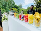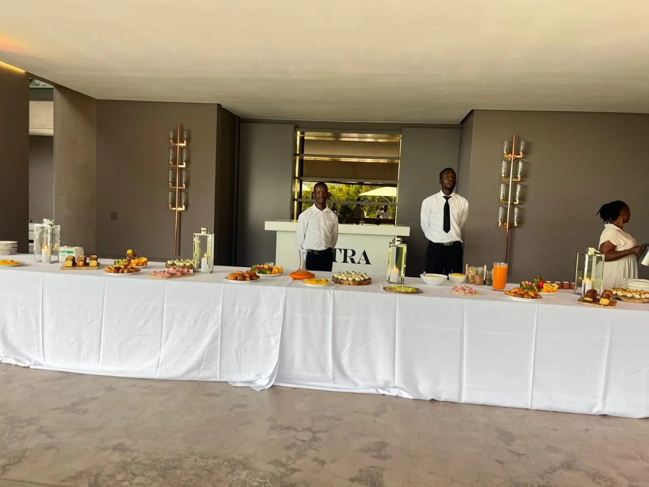 STAGE AND DECOR REQUIREMENTS • 9m x 6m white stage • Navy blue Manhattan Velvet Armchars that can accomodate seven (7) people on the stage • 1 x easle stand • 2 x large flower arrangements for the stage • 2 x Gold metal flower stands • Stage decoration baloons (navy blue, green, white and orange) • 1 x Unveiling curtain system (gold stand, navy blue curtain,navy blue unveiling ribbons) • 2 x Navy blue decorative pull bows • 7 x round coffee table (gold metal and glass on top) • 1 x glass display box Request service provider to come and take measurements for the stage on site