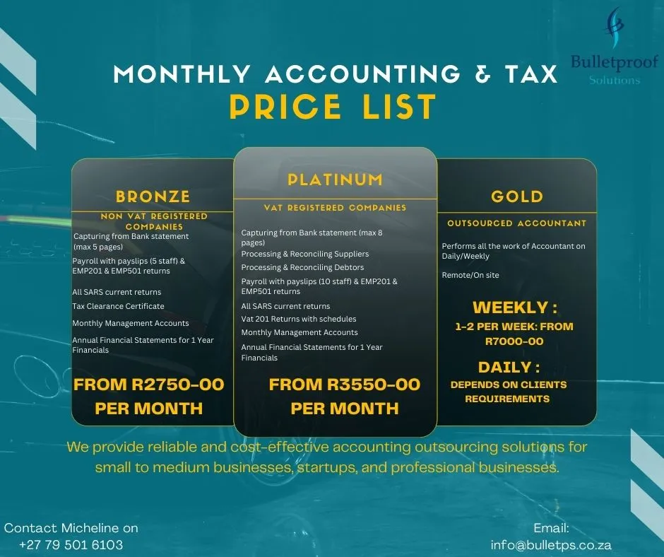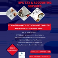 About: We provide reliable and cost-effective accounting outsourcing solutions for SME professionals. Monthly fees from R2750 per month. Services include: Full bookkeeping & monthly processing Backlog financials & clean-ups Management accounts & financial reporting Payroll processing & submissions VAT, PAYE & income tax returns SARS compliance, debt management & negotiations Annual financial statements Company secretarial & compliance support Ensure SARS compliance and deadlines are met