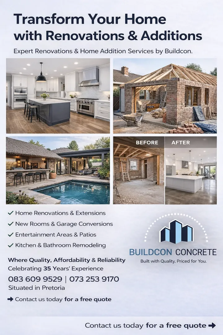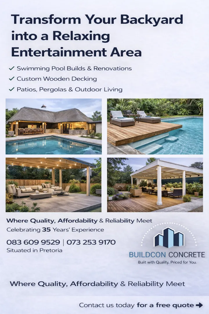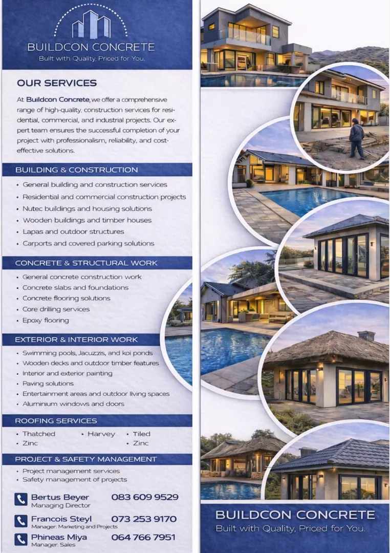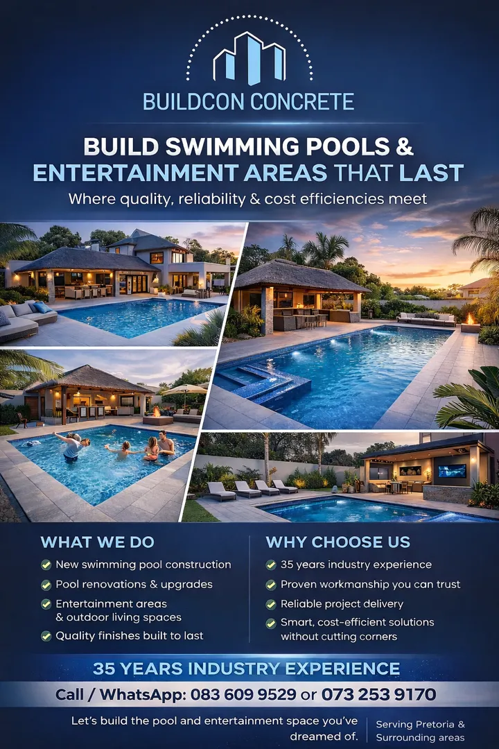 About: Bercon Construction & Civils brings over 32 years of experience in delivering quality building and civil services across Pretoria, Centurion, and Johannesburg. We offer competitive pricing and a wide range of solutions, including new builds, renovations, maintenance, swimming pools, decking, lapas, and Nutec houses. Our team is dedicated to providing tailored solutions that meet your needs while ensuring outstanding workmanship and client satisfaction.