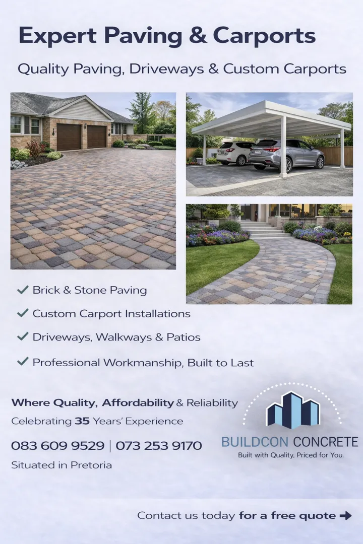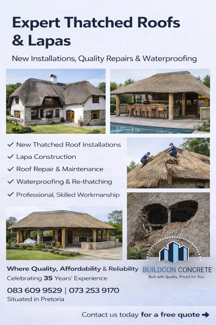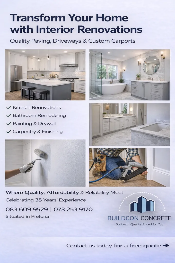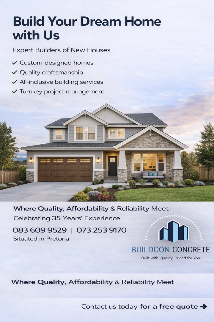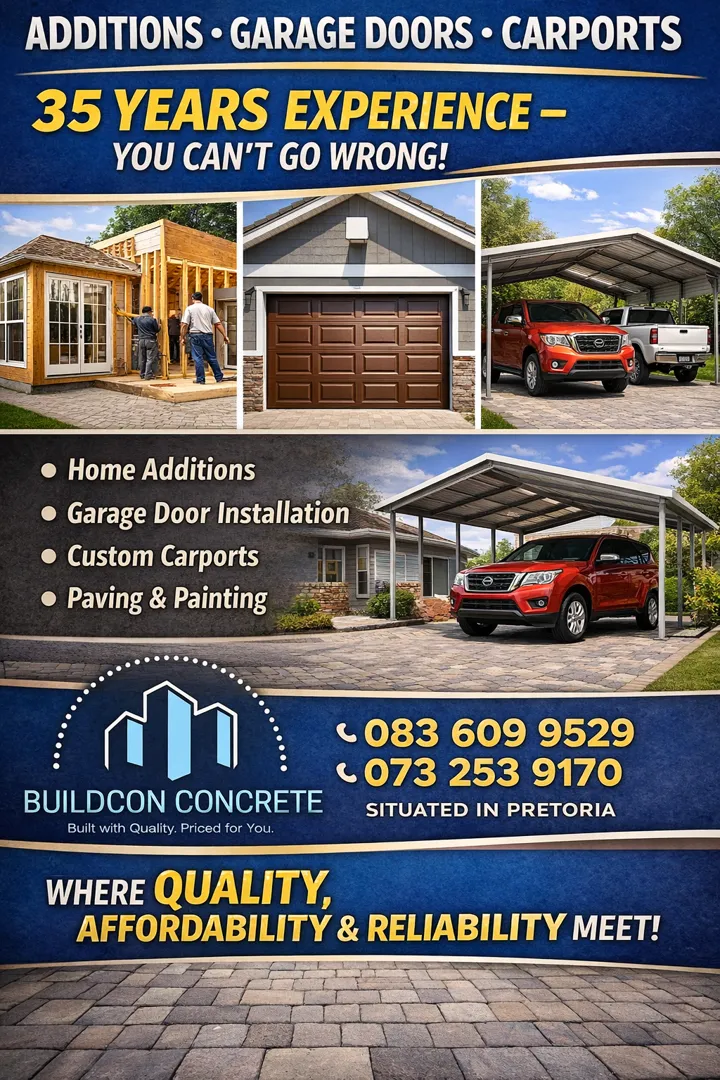 About: Bercon Construction & Civils brings over 32 years of experience in delivering quality building and civil services across Pretoria, Centurion, and Johannesburg. We offer competitive pricing and a wide range of solutions, including new builds, renovations, maintenance, swimming pools, decking, lapas, and Nutec houses. Our team is dedicated to providing tailored solutions that meet your needs while ensuring outstanding workmanship and client satisfaction.