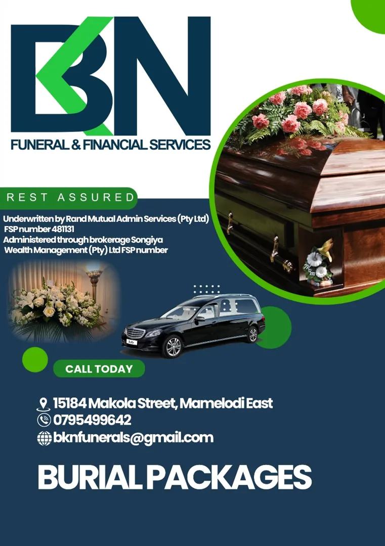 About: BKN Funeral Services is a member of National Funeral Association of South Africa. We are based in Pretoria, Mamelodi East. Our products are underwritten by Rand Mutual Assurance. We are available for cash funerals and have burial packages that may suitable for your needs and affordable by choosing and pay monthly. We also have funeral policies ranging from R10 000 to R30 000 for individuals, families, social clubs, stokvels and churches. We also render catering services.