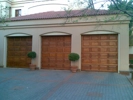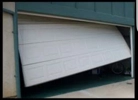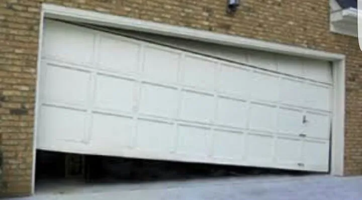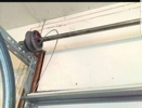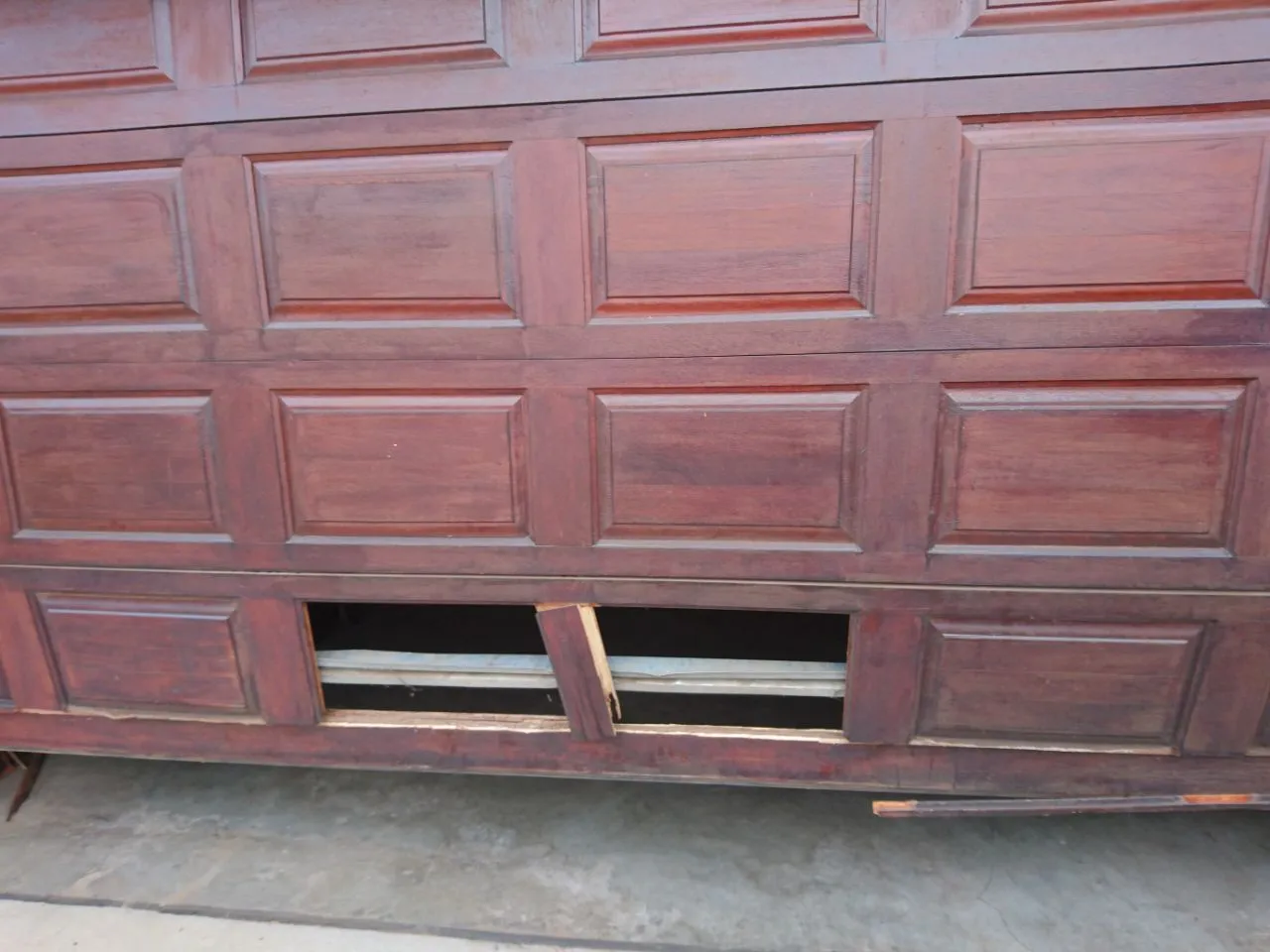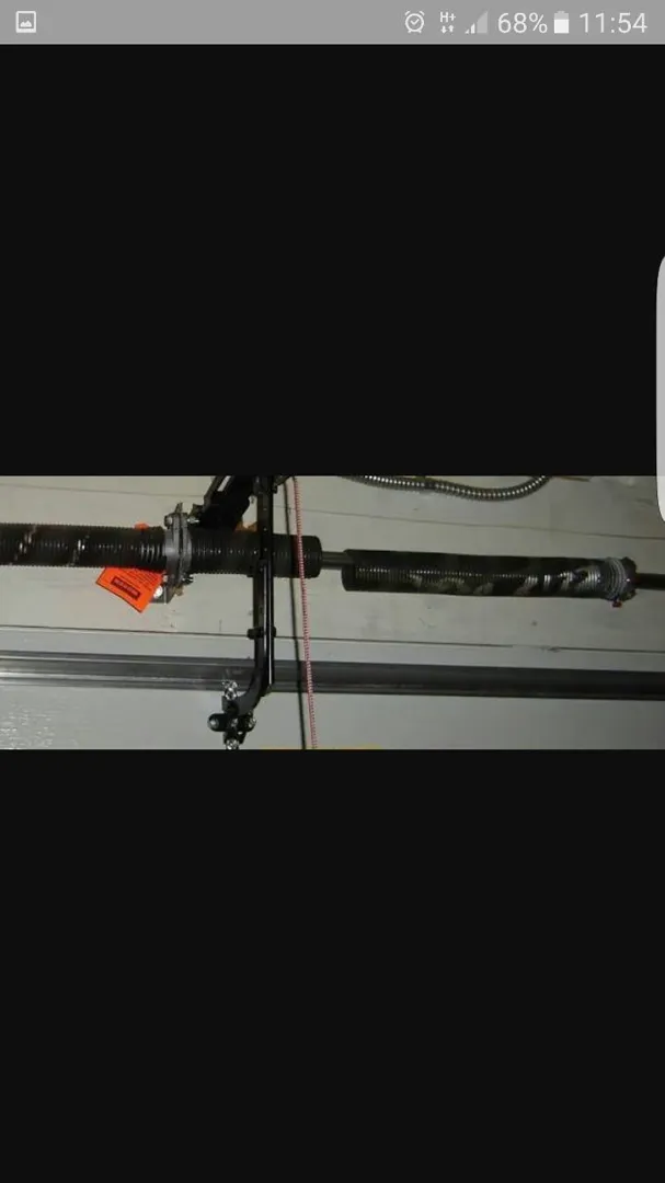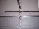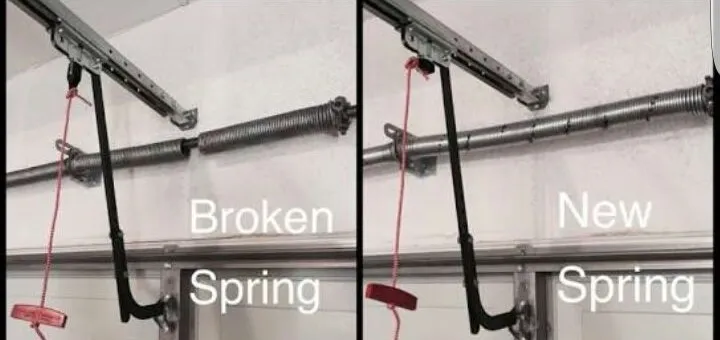 Spring broken on wooden garage door.