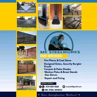 About: Mk Steelworks Specialize in welding manufacturing products and interior steel furniture including Built-in fireplaces and free standing braai ,Wall washen lines,Burglar proofs,Gates, Solid Carport ,Outdoor tables with chairs, Benches,Structural Construction and also Services and Refurbished the mention Products We also a Custom-made business we gladly be happy to explore and deliver what is required
