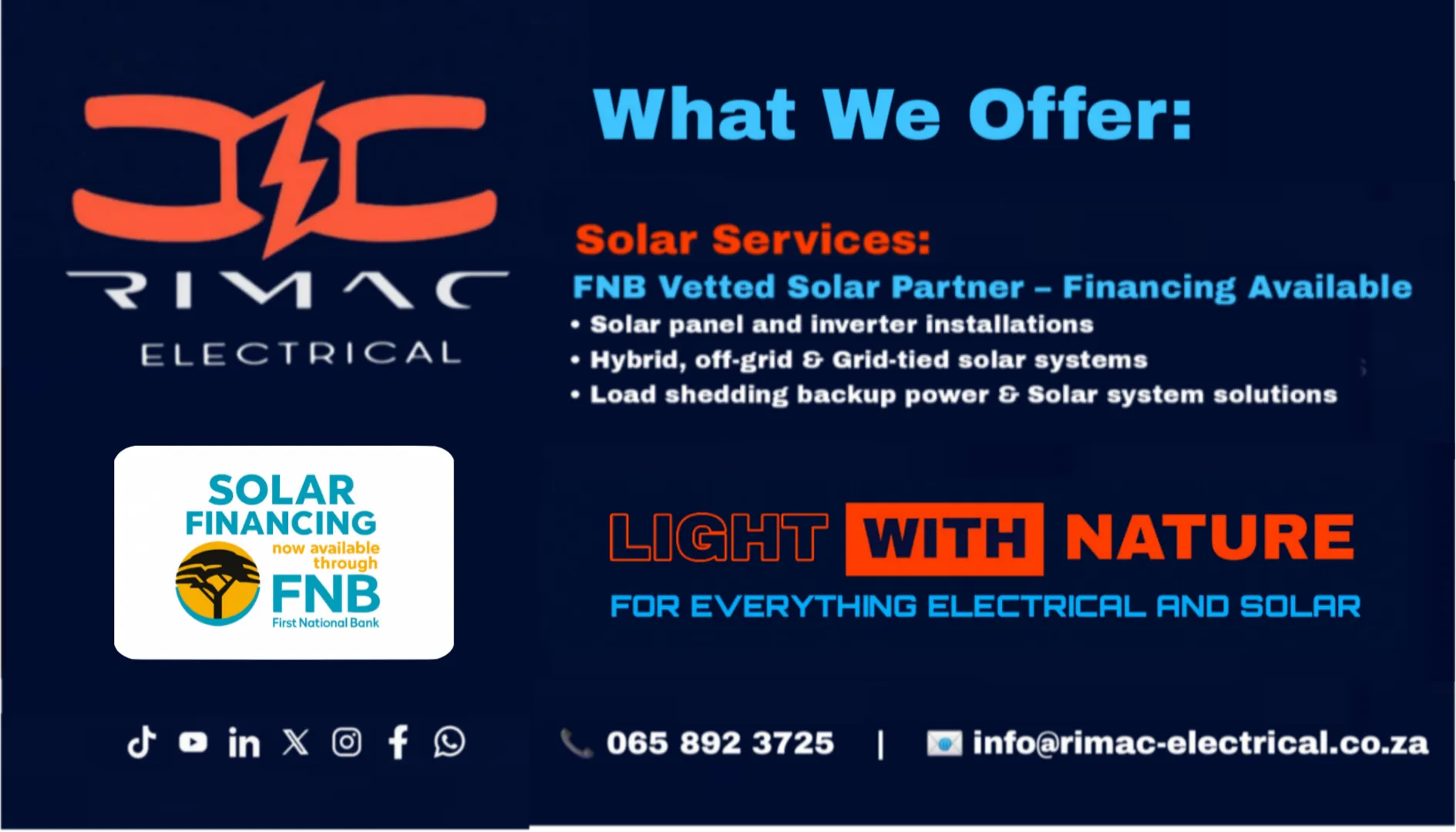 About: Rimac Electrical and Solar is a highly trusted and dependable company specializes in expert electrical and solar installation services. As a proud South African company under Ngove X (Pty) Ltd, we specialize in top-tier electrical and solar installation services. We deliver high-quality, compliant, and customer-focused solutions for various sectors. Whether it’s emergency repairs or full-scale system installations, our experienced team ensures safe, efficient, and long-lasting results.