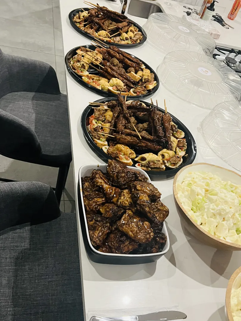 - Starter: Samoosas and Kebabs -Main Couse: Saucy Chicken and Lam Karai woth sides of rolls and roti -Desserts and Cakes for tea.