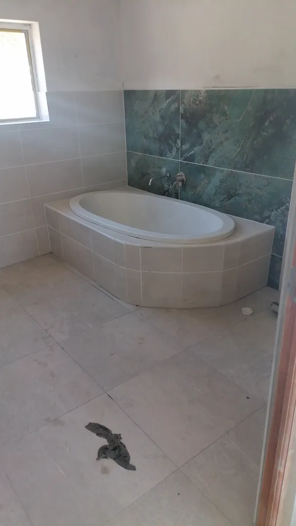 It is a 4 bedroom house, lounge, sitting room, kitchen, storage, two bathrooms and two garages already built up. There're no ceiling and no tiling on the floor. The bathrooms are poorly done and put in showers and geyser, redo water connections. No kitchen cupboards/built-ins. No water connections in the kitchen. No skirting around the house and the drive way needs to be done. No guttering. The square meters are as follows: - Sitting room: 5.1 x 4.6 Dining room: 4.8 x 4.3 Kitchen: 4.6 x 4 Passage: 1.3 x 6.9 Bedroom 1: 4.6 x 4 Bedroom 2: 4.6 x 4 Bedroom 3: 4.6 x 5.4 Main Bedroom: 6.2 x 6.2 & 1.3 x 2.8 Storeroom: 4.6 x 2.5 Bathroom 1: 4.6 x 2.1 Bathroom 2: 4.6 x 3