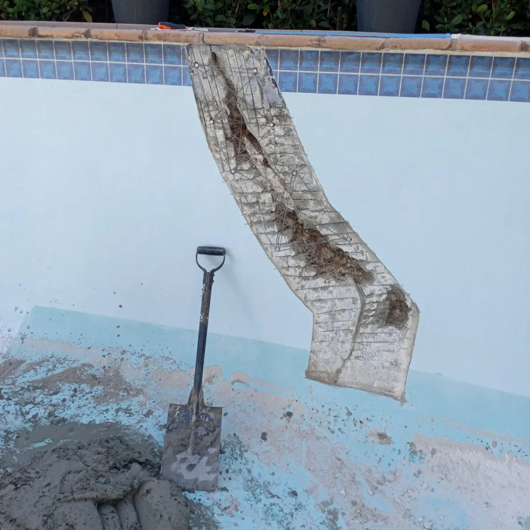 It’s a small beach pool. The gunnite surface is coming off when we scrape the walls while cleaning. Those little gravelly bits are loose & now just collecting on the bottom of the pool. There are also cracks. The pool is about 25years old. I don’t know what the size is in litres or square meters. But at its deepest it’s shoulder height and I’m about 5.6 f tall.