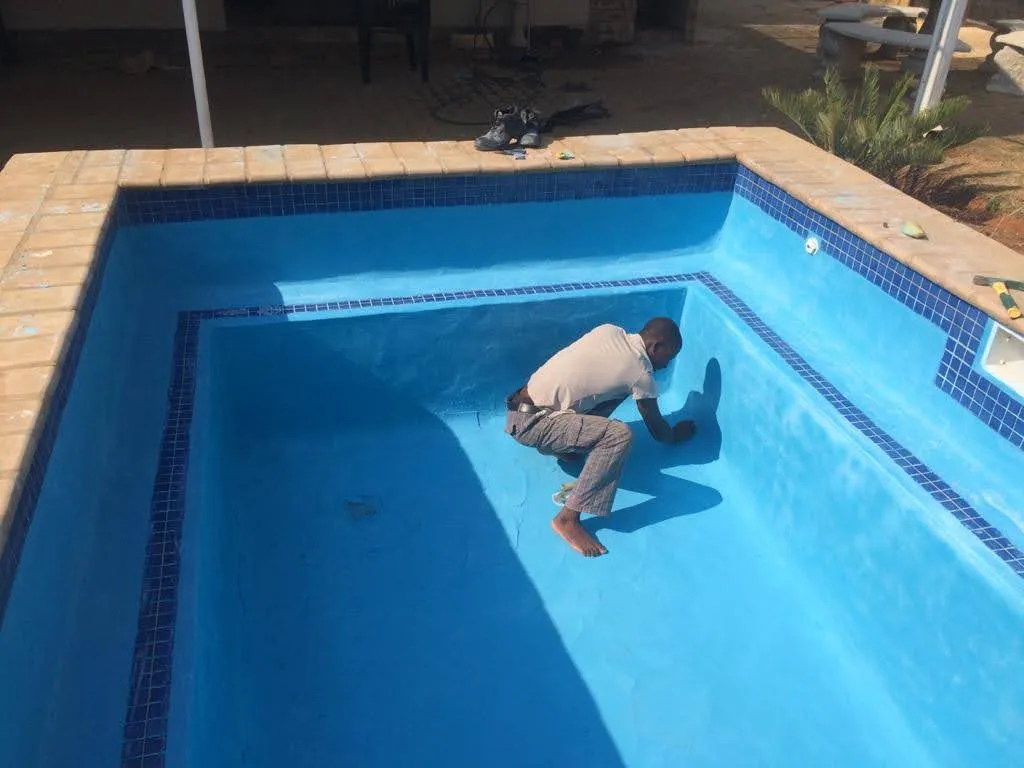 Our pool is concrete, old school size pool 12mX6m, max depth 3.2m & shallow 1.5m deep. - Draining of pool ( Liters) - Replacing of sand - Installing of a new leaf suction catcher - 9x Cracks Filled & Sealed - Scrubbing the pool to remove grime, dirt and mold - Underwater epoxy for tiles on steps - Spirits of Salt to remove stains and dirt marks