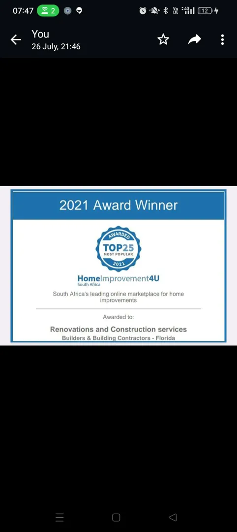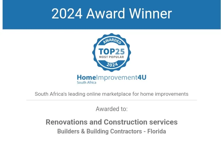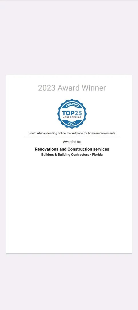 About: Renovations and construction services has been in business since 2020, and we have done more than 400 projects. We are building contractors and do anything from small to big jobs. We do the following services: concrete work, brickwork, roofing, plaster and screeds, painting,electrical and plumbing, tiling, ceilings and drywalling, carpentry,paving, steel work and more .