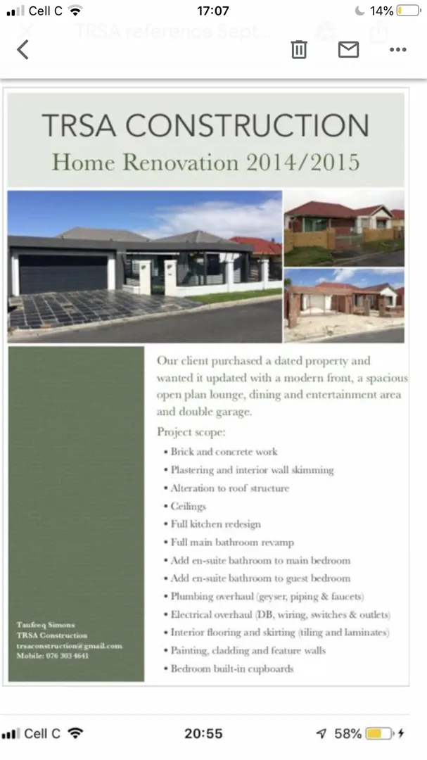 About: TRSA construction specialises in all building-related projects including maintenance, tiling, plumbing, ceiling, flooring, electrical, painting, waterproofing, roofing & all other building-related services. With more than 100 satisfied customers,we will ensure that all your building needs are met with efficiency, reliability & professionalism.