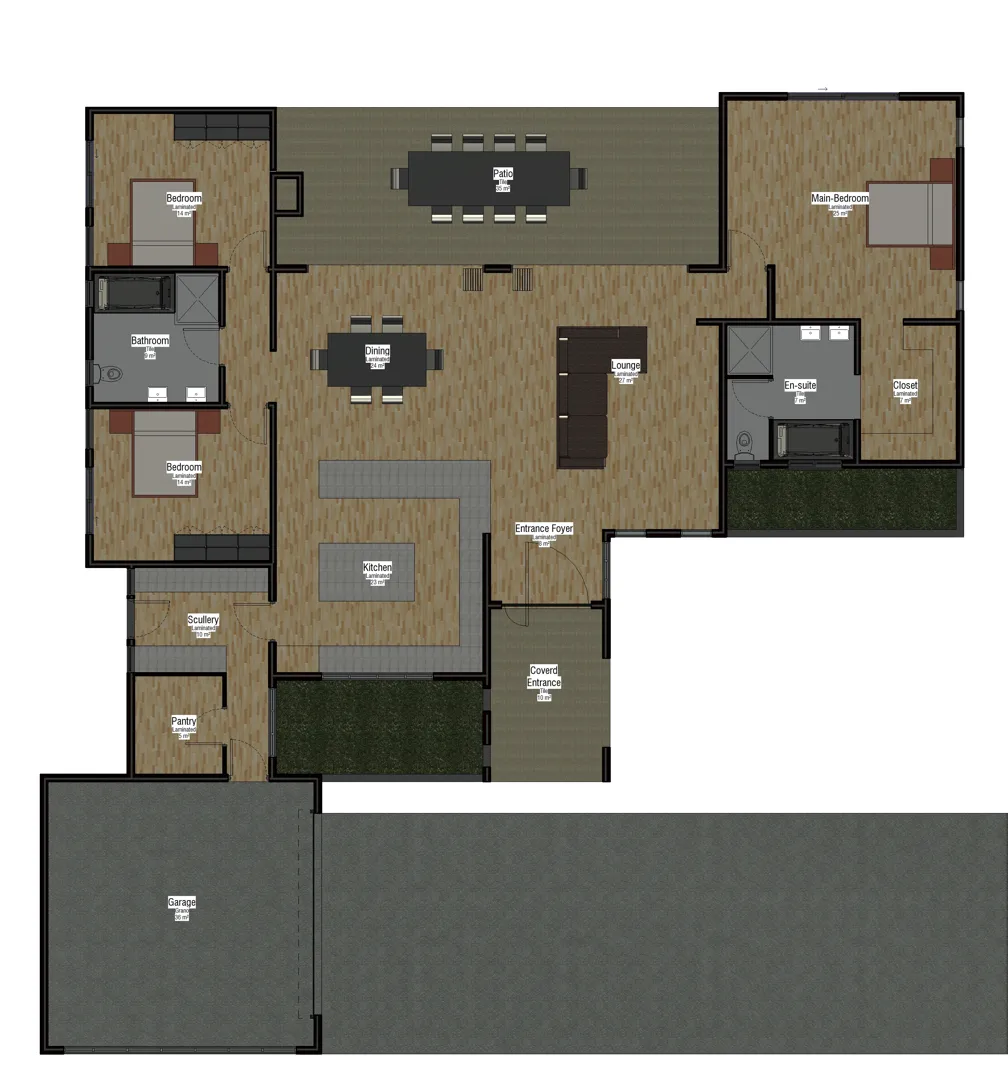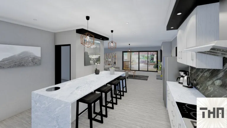 Extension kitchen and lounge by 2,5 M, change the existing living room to two bedrooms, change and close existing patio to a bar space and top deck above it with outside stairs for outside entertainment area, 4 x 3 splash pool, and a new hip roof plan.